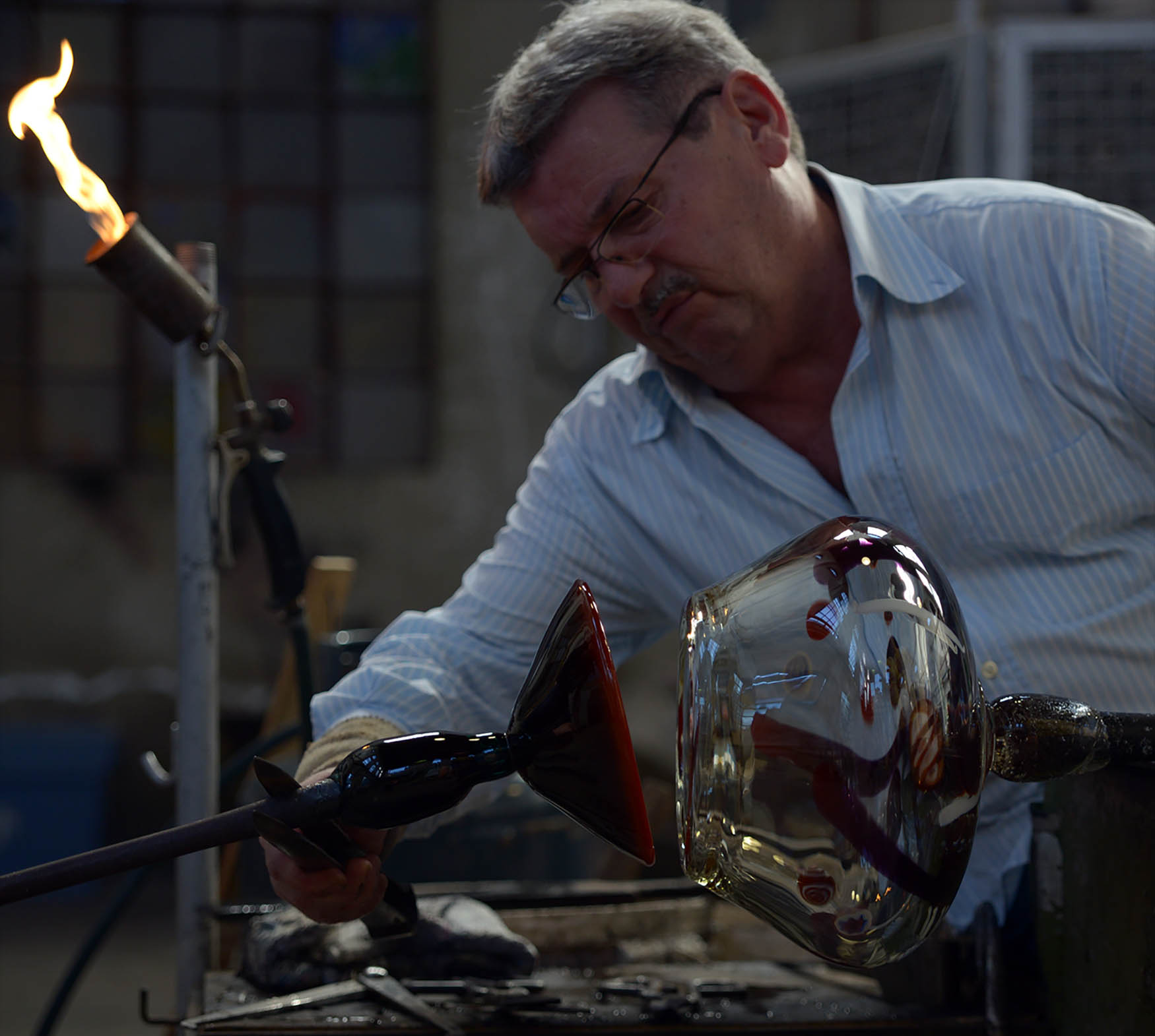 He was born in Venice on 14 October 1949. He started to work glass when he was just 10 years old, learning from the great master Livio Seguso. At the age of 16, Fulvio Scarpa gave him his first job as a master glass-maker. In 1979, he founded Filigrana srl, a corporation with artistic vocation in line with the increasingly authoritative Paolo Crepax, which made a name for itself on the market of artistic glass thanks to its elegant creations made of filigree, drawn with fire and forged by passion. In 1985, a panel of illustrious Master Glass-makers (such as Alfredo Barbini, Archimede Seguso, Ermanno Nason and Silvio Seguso) celebrated his talent by presenting him with the prestigious “Murano Award” for his plate “Homage to Mirò”. The collaboration with the painter Riccardo Shwarizer confirmed his artistic talent, resulting in Crepax winning the “Murano Award” the following year as well. The acknowledgments and awards obtained by Crepax throughout the world, from New York to Paris, from Dusseldorf to Barcelona, are just as important. Hence, Crepax made a name for himself in Murano as a Master Glass-maker with a passion for design and fashion, boasting important collaborations in the world of furnishing accessories. His last creation is particularly amazing: a set of vases that, defying the laws of physics, find a never-before-seen balance between bold shapes and delicate transparencies… a metaphor for a life that is not satisfied with perfection.
