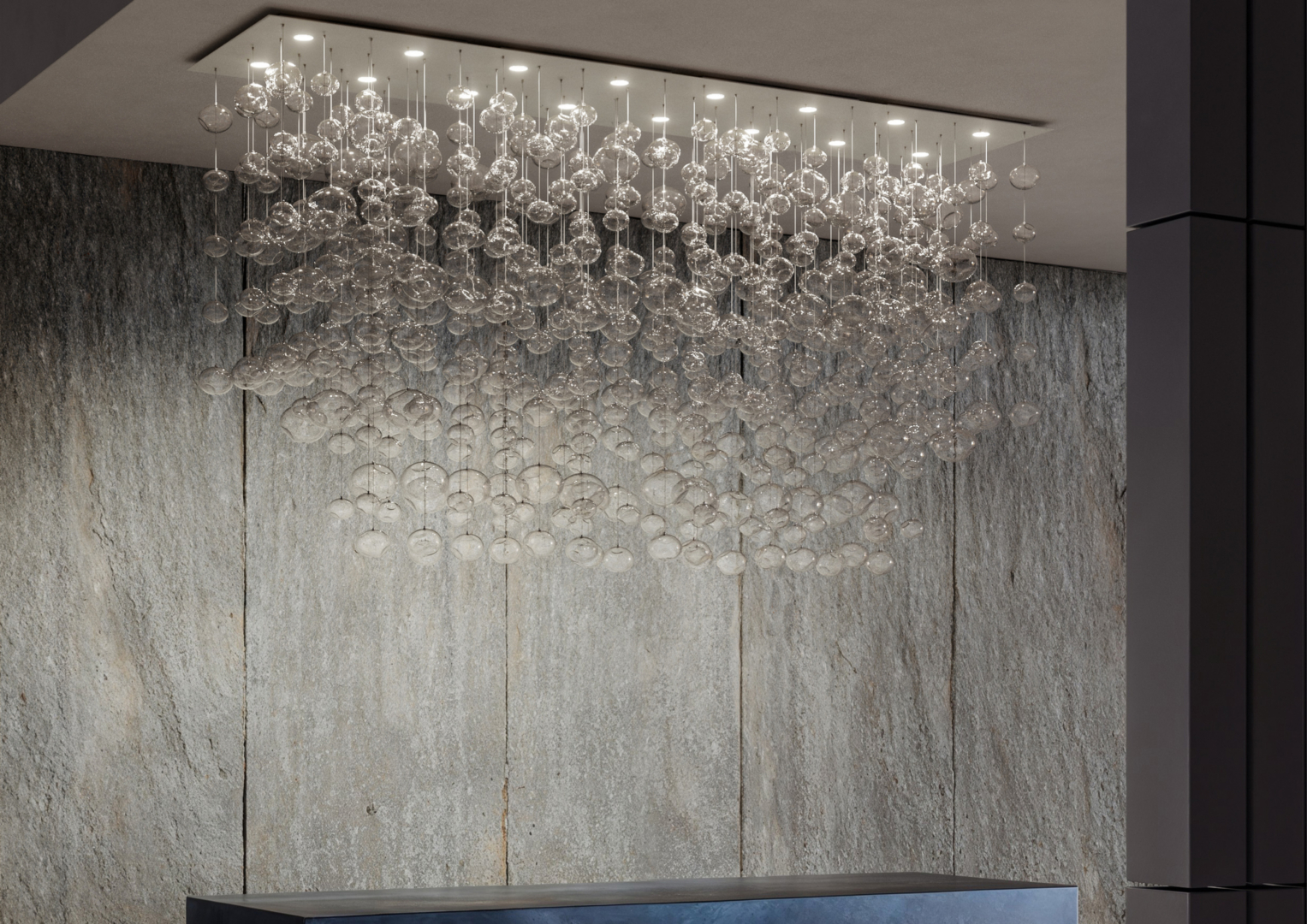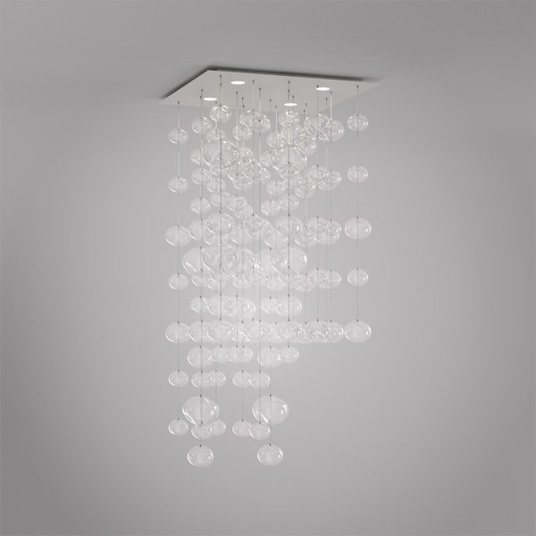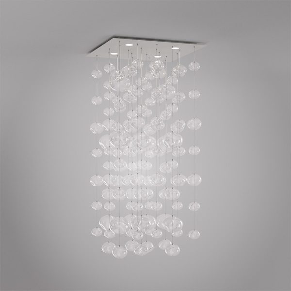 Progettata da Patrick Jouin, Ether è una lampada a sospensione che illumina e trasforma lo spazio con composizioni a cascata di sfere trasparenti in vetro borosilicato soffiato. È composta da gruppi di elementi in vetro, disponibili in tre dimensioni, ciascuno realizzato a mano e caratterizzato da una superficie irregolare unica, così che non ne esistano due uguali. Il risultato è un etere di vetro e luce scintillante che affascina e incanta. Ether è disponibile in 3 versioni standard (Ether S, Ether S 90 ed Ether S 150), ma può essere personalizzata in qualsiasi dimensione, finitura o configurazione. Oggi, Ether si evolve con l’integrazione di sorgenti luminose a LED, migliorando l’efficienza energetica e la qualità della luce, e offrendo al contempo nuove possibilità di installazioni personalizzate grazie a una gamma ampliata di rosoni a soffitto. I nuovi rosoni metallici in bianco opaco sono ora disponibili in due misure tonde (Ø48 cm e Ø68 cm) e in una versione quadrata (70x70 cm), progettati sia per installazioni singole sia modulari. Questi rosoni consentono di disporre più elementi in composizioni lineari, raggruppate o quadrate, offrendo una maggiore flessibilità progettuale.