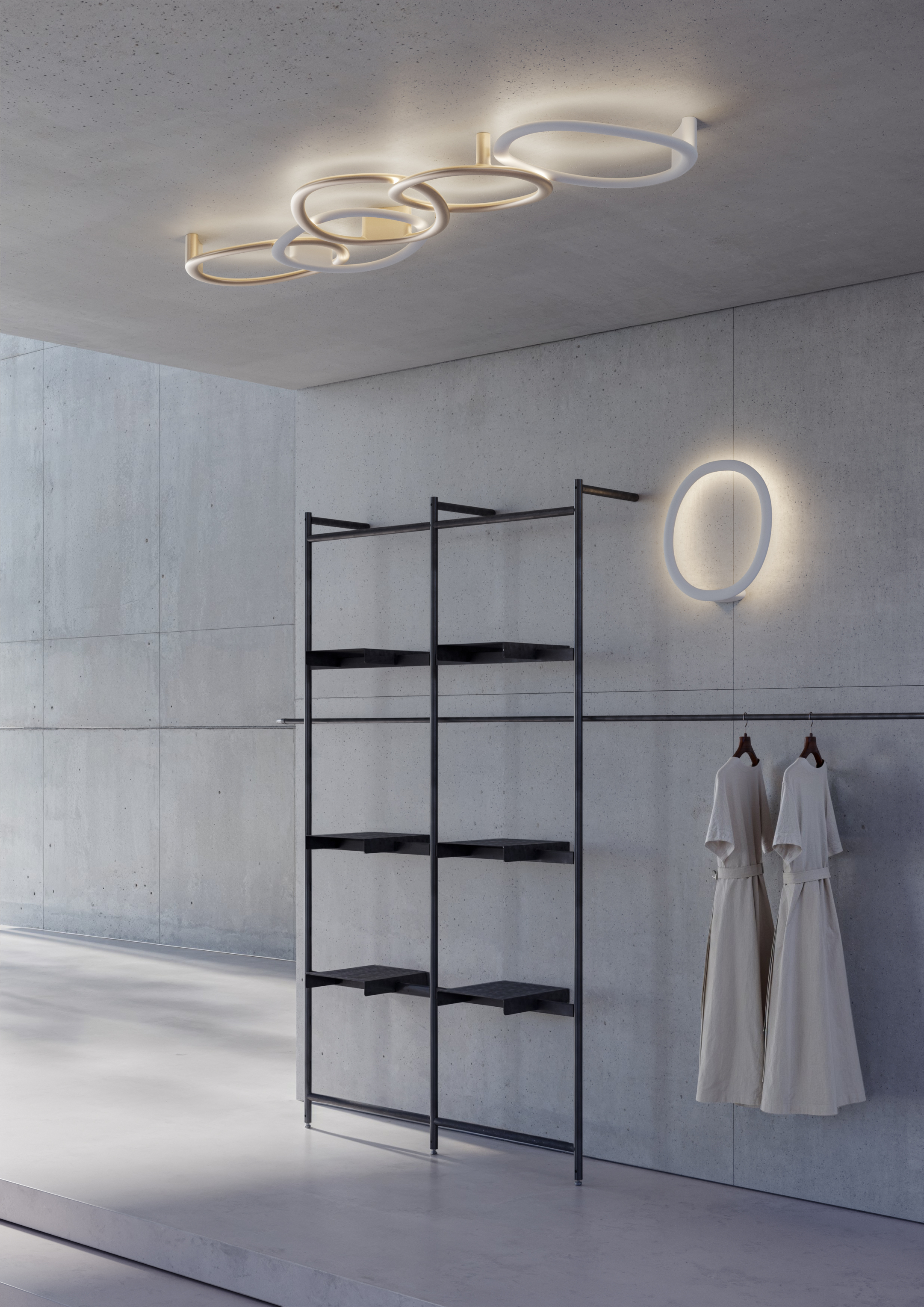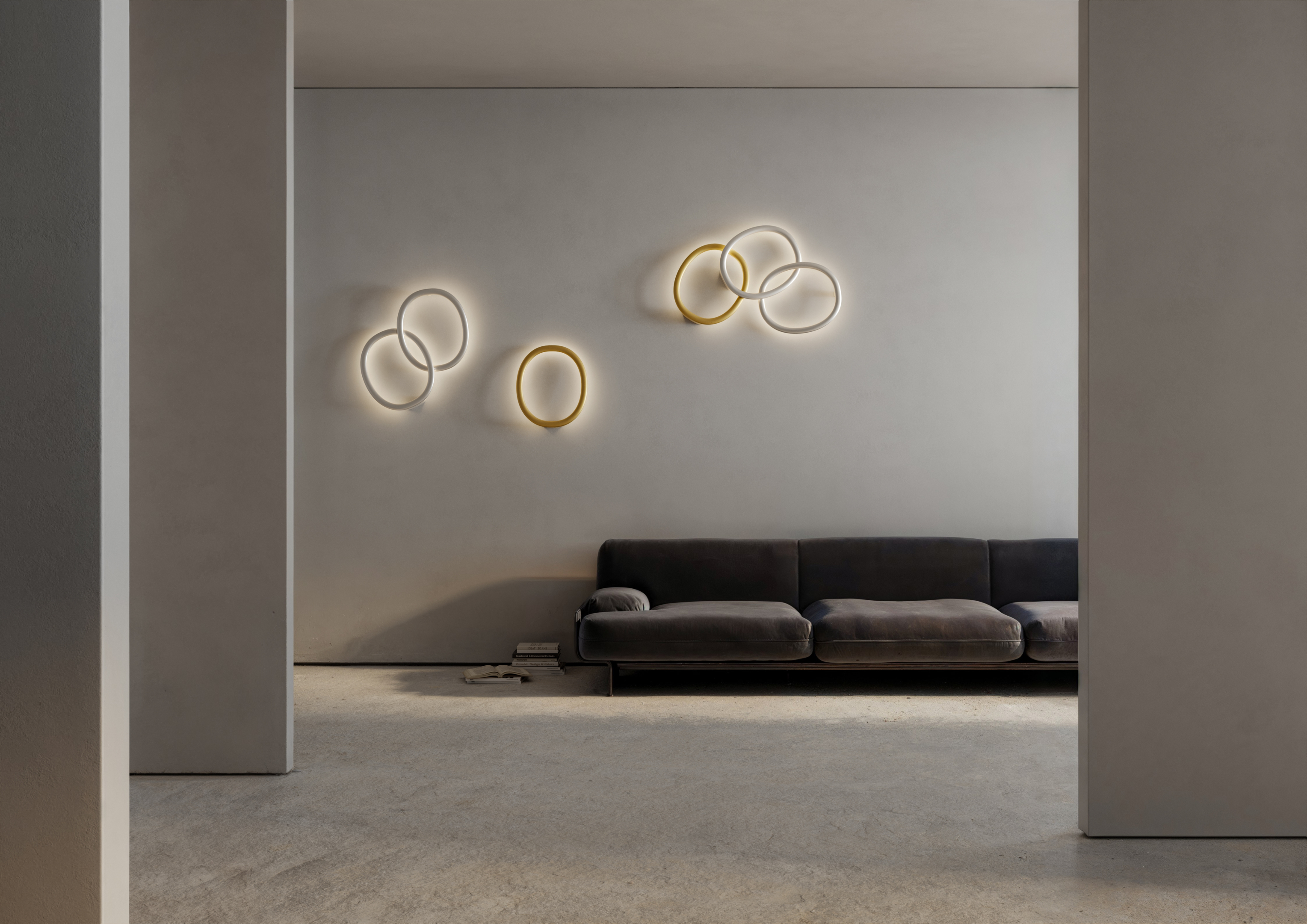 Progettata da Patrick Jouin, OR è una linea luminosa, un gioco di anelli che si sfiorano, si incrociano e si sovrappongono. Vista di fronte, una silhouette decisa, una linea pura. Vista in movimento, la percezione cambia: emerge la profondità, gli anelli si separano, scivolando l’uno nell’altro. La luce morbida e diffusa abbraccia la parete, proiettando ombre sottili, delineando contorni in continua evoluzione. Disponibile nella versione singola (OR1) parete e soffitto, con dimensioni di 46 cm x 40,5 cm, o nella configurazione doppia (OR2), con due anelli incrociati di 60 x 70,5 cm, la lampada si adatta e si trasforma, creando installazioni luminose su misura. Il diffusore decorativo, in poliuretano verniciato, è disponibile nelle finiture bianco opaco e champagne.