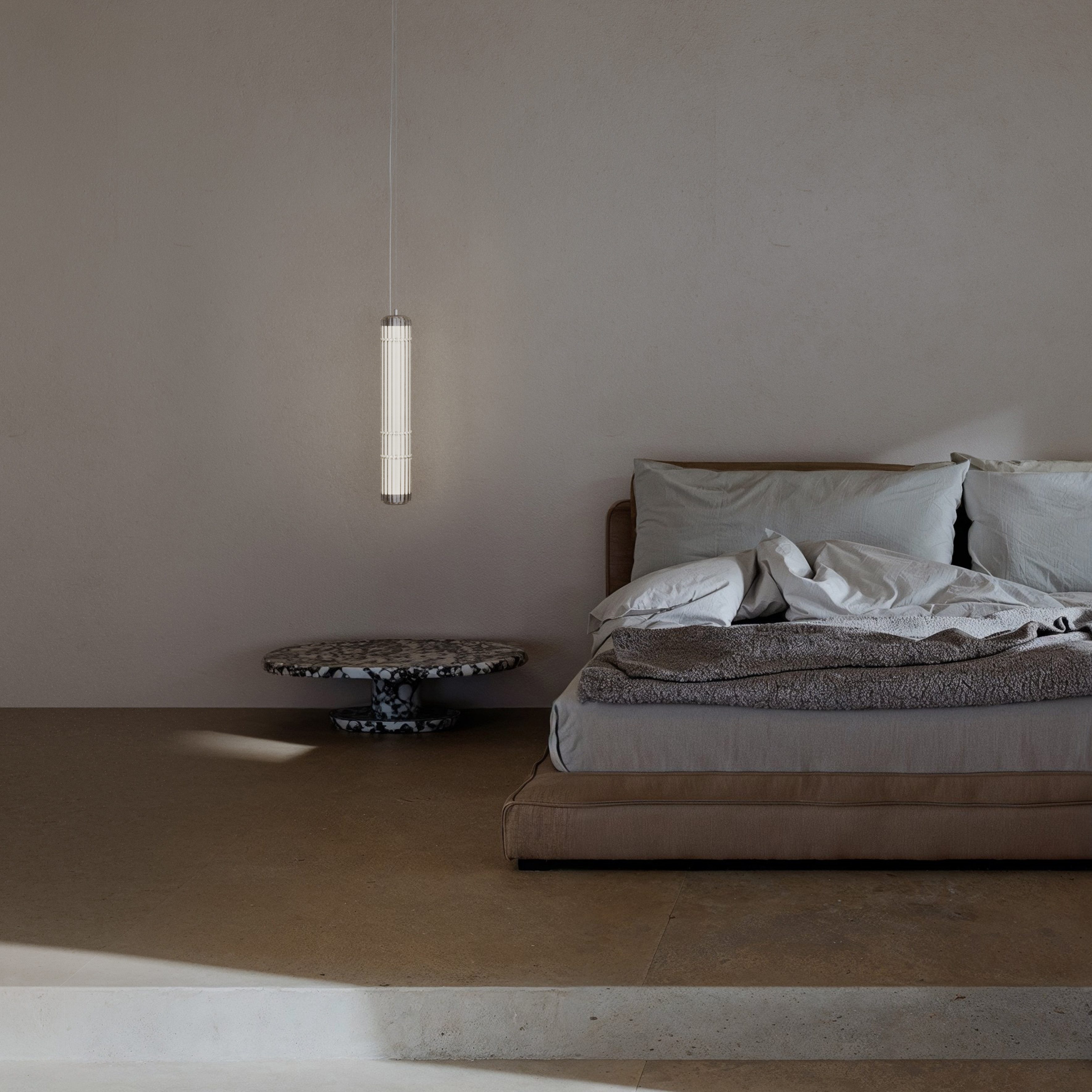 Progettata da Rockwell Group, la Collezione Stacking unisce tecnologia all'avanguardia e tecniche tradizionali di lavorazione del vetro. Comprende tre serie di lampade da terra e una serie di lampade a sospensione orizzontali e verticali. La versione da terra è stata disegnata nel 2007 e rende omaggio alla ricca tradizione vetraria veneziana che utilizza la tecnica chiamata “incamiciato”: abili maestri vetrai sovrappongono vetri con proprietà distinte, creando un affascinante mosaico di colori e opacità dando vita a inaspettate sinergie di luce. Questa tecnica ad alta intensità di lavoro crea diversi colori e opacità in ciascun modulo di vetro. Quando questi moduli cilindrici si accostano e si sovrappongono, un accattivante mix di colori proietta una sofisticata luce su tutto l'ambiente circostante. Nel 2023, alla collezione "terra" si aggiungono le lampade a sospensione. Stacking S è composta da un corpo cilindrico con diffusore centrale alimentato da 5 strip LED di alta qualità. Gli elementi decorativi sono una composizione di vetri dalle diverse lunghezze in borosilicato soffiato. Elementi in alluminio tornito dal pieno posti alle due estremità della lampada servono come chiusura e punti di fissaggio per la sospensione. È disponibile anche la versione “Naked” (senza vetro decorativo). Con tre diverse misure per la versione verticale e due per l'orizzontale, la gamma a sospensione può funzionare in composizioni multiple e creare forme di luce belle e affascinanti.