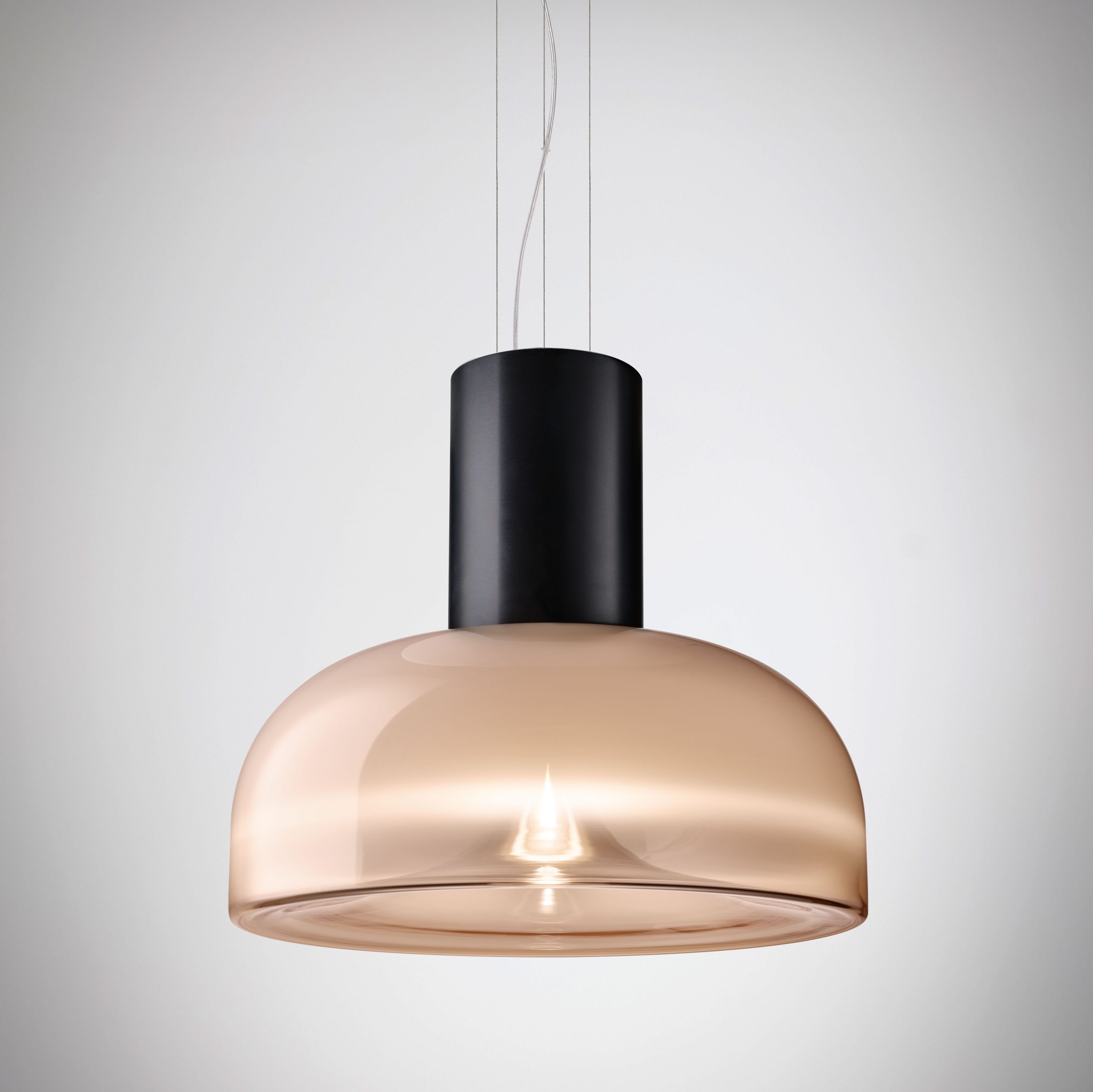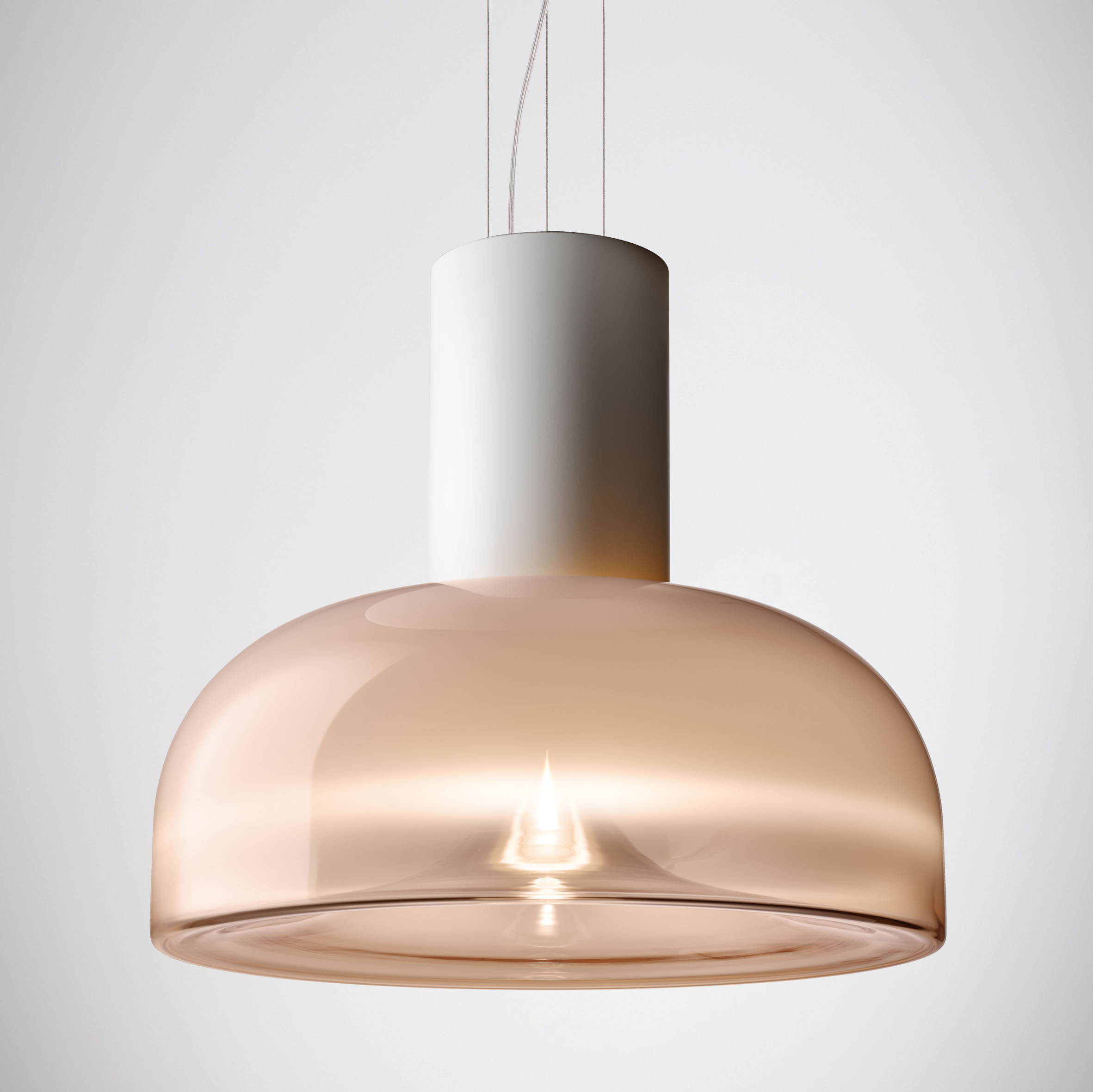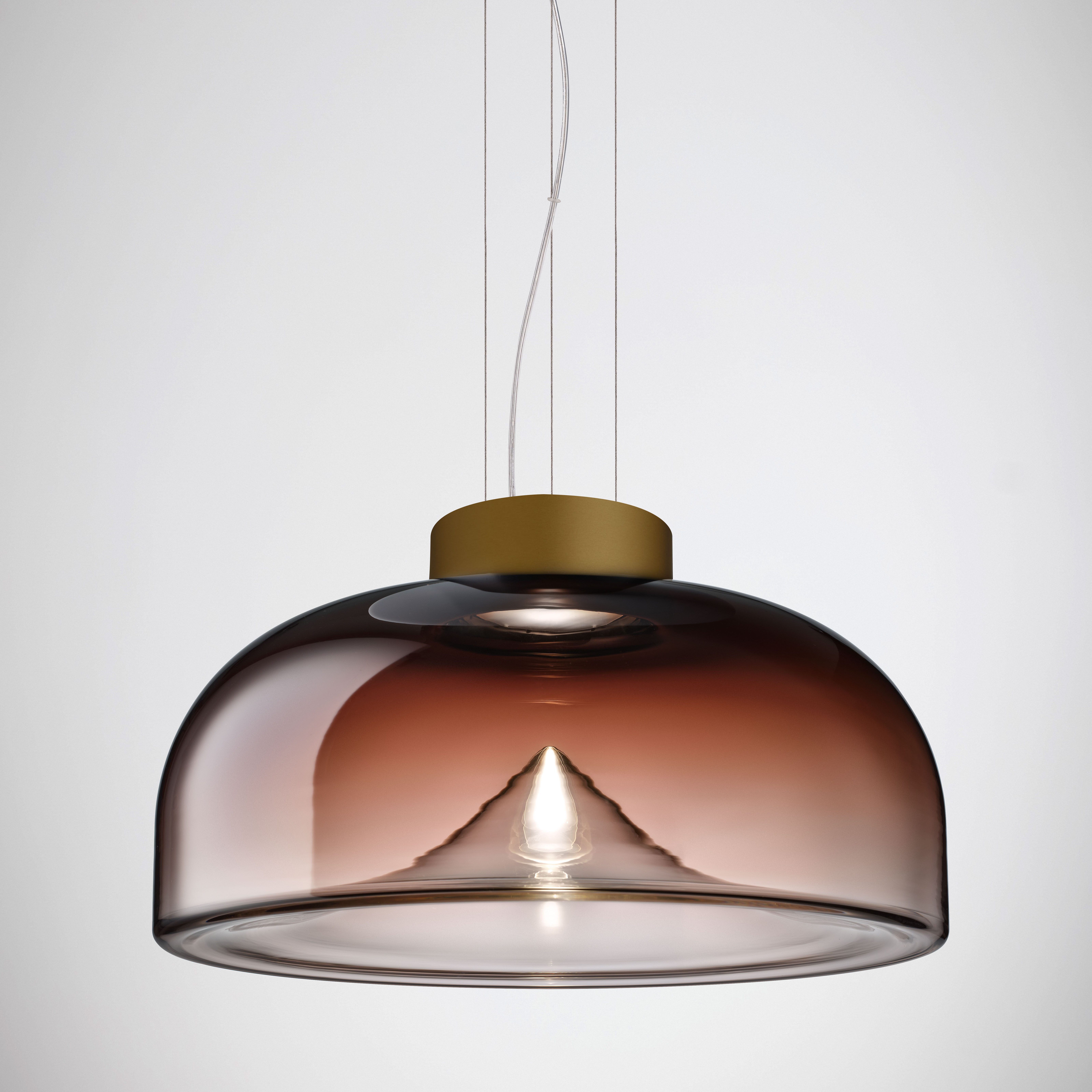 Aella is the ‘whirlwind’, embodied by the dynamic movement captured in its handblown glass diffuser. Emanating from the single point, an evanescent light cone grows to create sinuous patterns and harmonic reflections. Designed in 1968 by Toso and Massari, this table and suspension lamps collection incorporates the essential and timeless design principles, characteristic of Leucos’ products. Available in two sizes for the table and suspension versions (Ø30 and Ø54 cm - Ø11 3/4” and Ø21 1/4”) with transparent or smoked glass diffuser. Structure in 4 finishes for the Ø54 cm version (glossy chrome, glossy warm white, vintage brass, matt gunmetal) and 3 finishes for the Ø30 cm version (glossy chrome, glossy warm white and glossy gunmetal) with matching canopy in the same color for the pendant version. The LED light source (Aella S 54 e Aella T 54) can be easily replaced by the user.