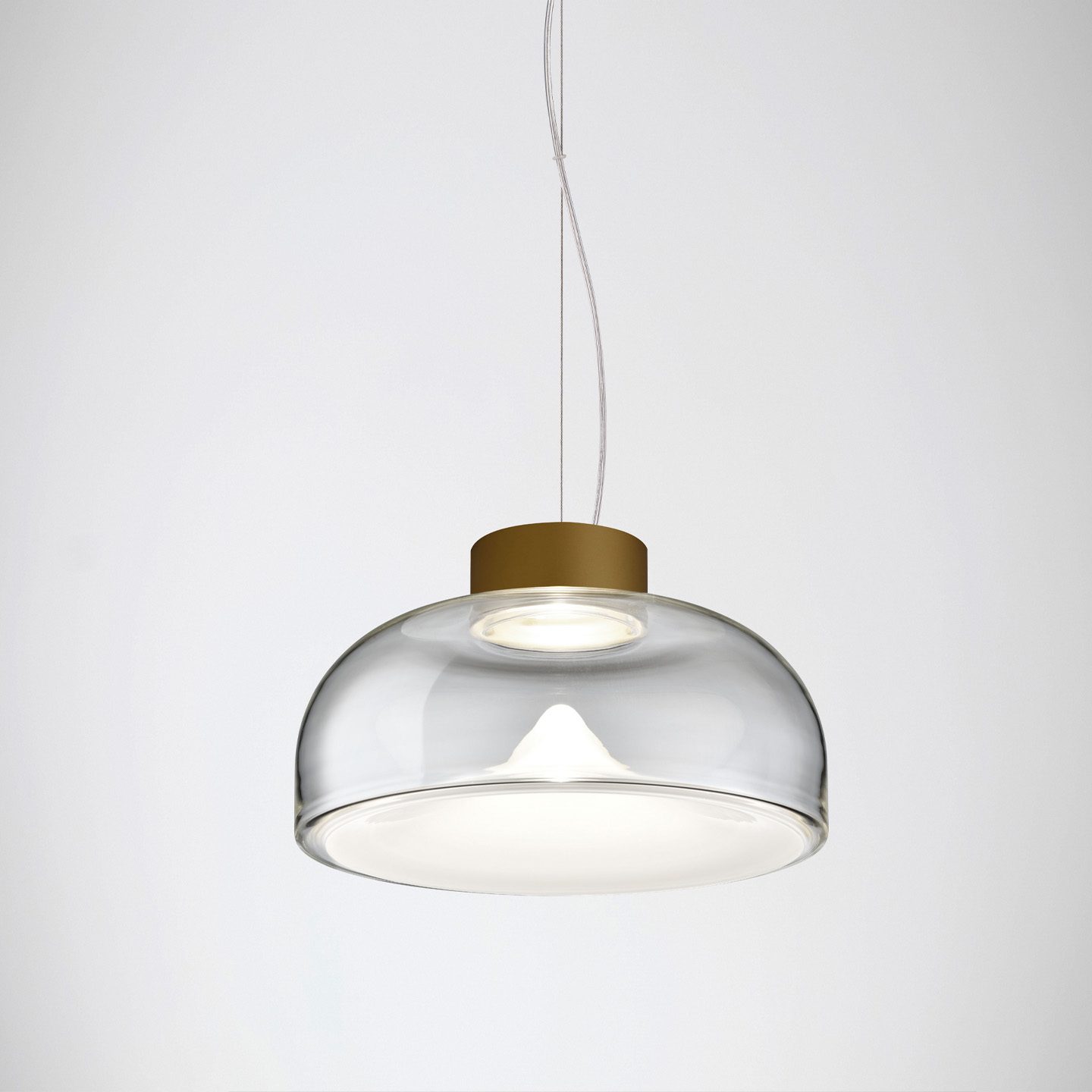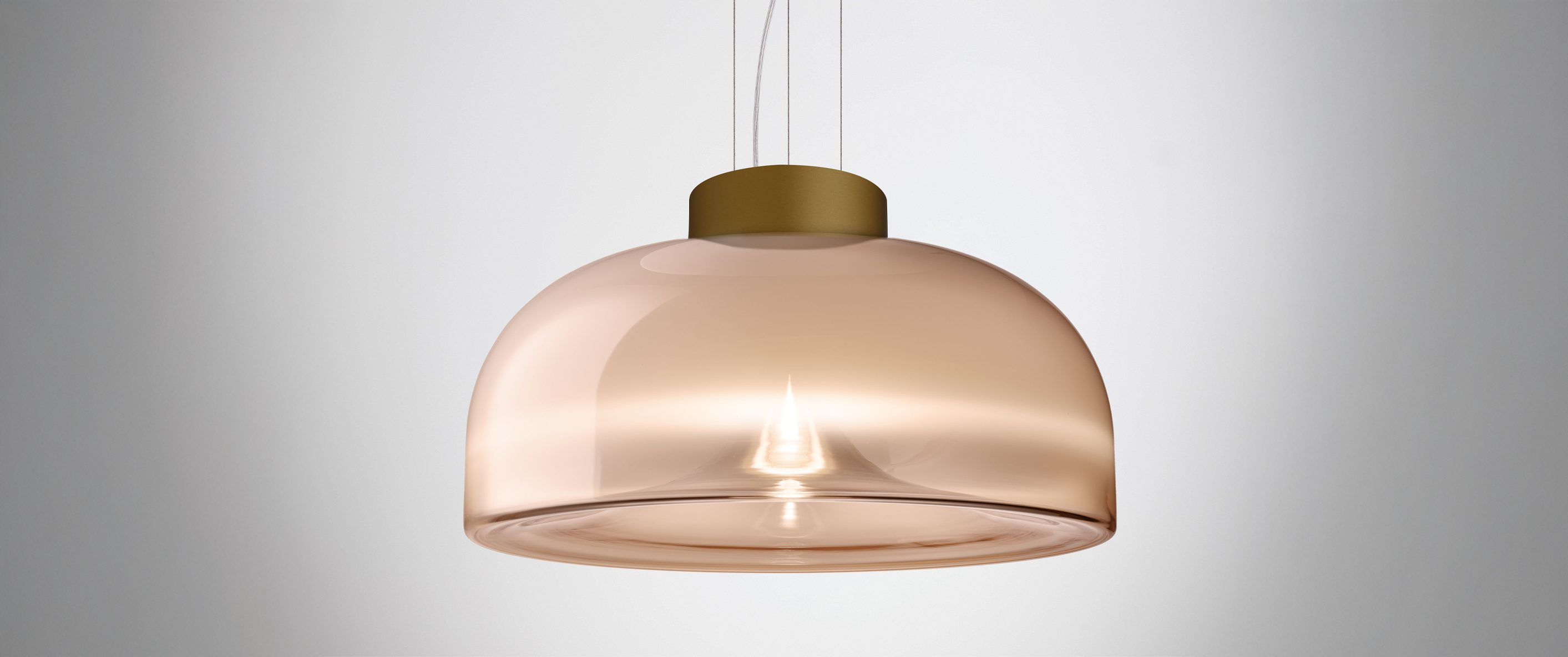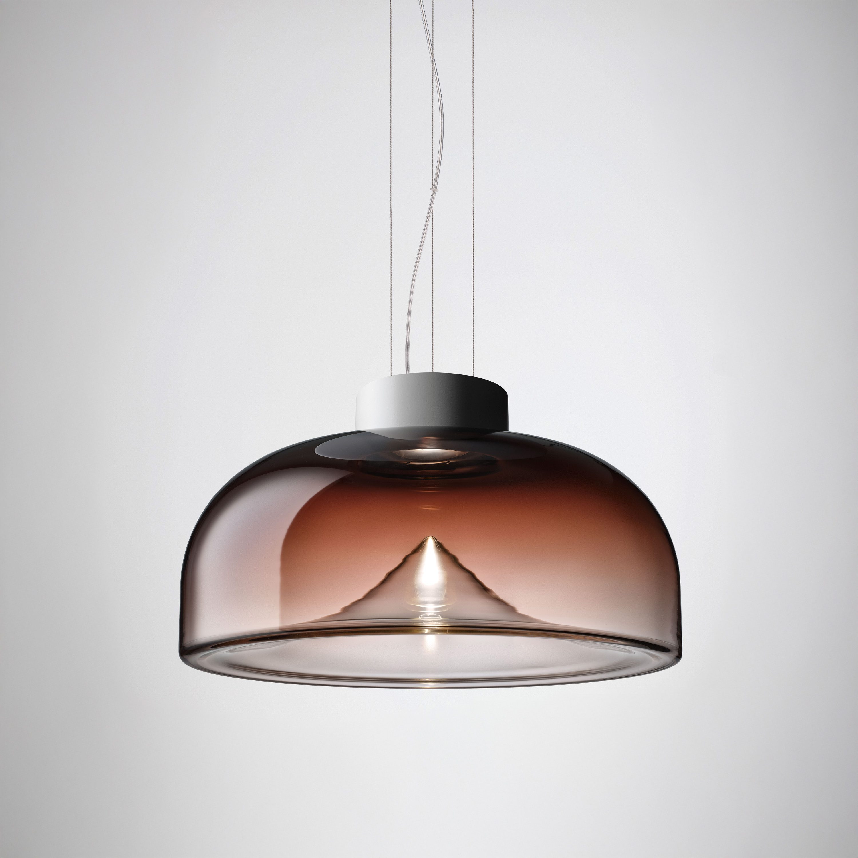 Aella is the ‘whirlwind’, embodied by the dynamic movement captured in its handblown glass diffuser. Emanating from the single point, an evanescent light cone grows to create sinuous patterns and harmonic reflections. Designed in 1968 by Toso and Massari, this table and suspension lamps collection incorporates the essential and timeless design principles, characteristic of Leucos’ products. Available in two sizes for the table and suspension versions (Ø30 and Ø54 cm - Ø11 3/4” and Ø21 1/4”) with transparent or smoked glass diffuser. Structure in 4 finishes for the Ø54 cm version (glossy chrome, glossy warm white, vintage brass, matt gunmetal) and 3 finishes for the Ø30 cm version (glossy chrome, glossy warm white and glossy gunmetal) with matching canopy in the same color for the pendant version. The LED light source (Aella S 54 e Aella T 54) can be easily replaced by the user.