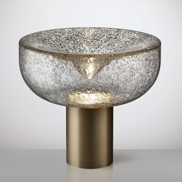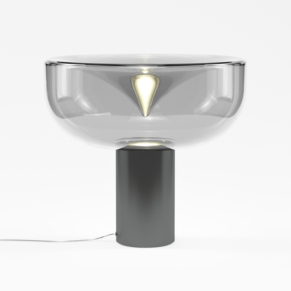 Aella is the ‘whirlwind’, embodied by the dynamic movement captured in its handblown glass diffuser. Emanating from the single point, an evanescent light cone grows to create sinuous patterns and harmonic reflections. Designed in 1968 by Toso and Massari, this table and suspension lamps collection incorporates the essential and timeless design principles, characteristic of Leucos’ products. Available in two sizes for the table and suspension versions (Ø30 and Ø54 cm - Ø11 3/4” and Ø21 1/4”) with transparent or smoked glass diffuser. Structure in 4 finishes for the Ø54 cm version (glossy chrome, glossy warm white, vintage brass, matt gunmetal) and 3 finishes for the Ø30 cm version (glossy chrome, glossy warm white and glossy gunmetal) with matching canopy in the same color for the pendant version. The LED light source (Aella S 54 e Aella T 54) can be easily replaced by the user.