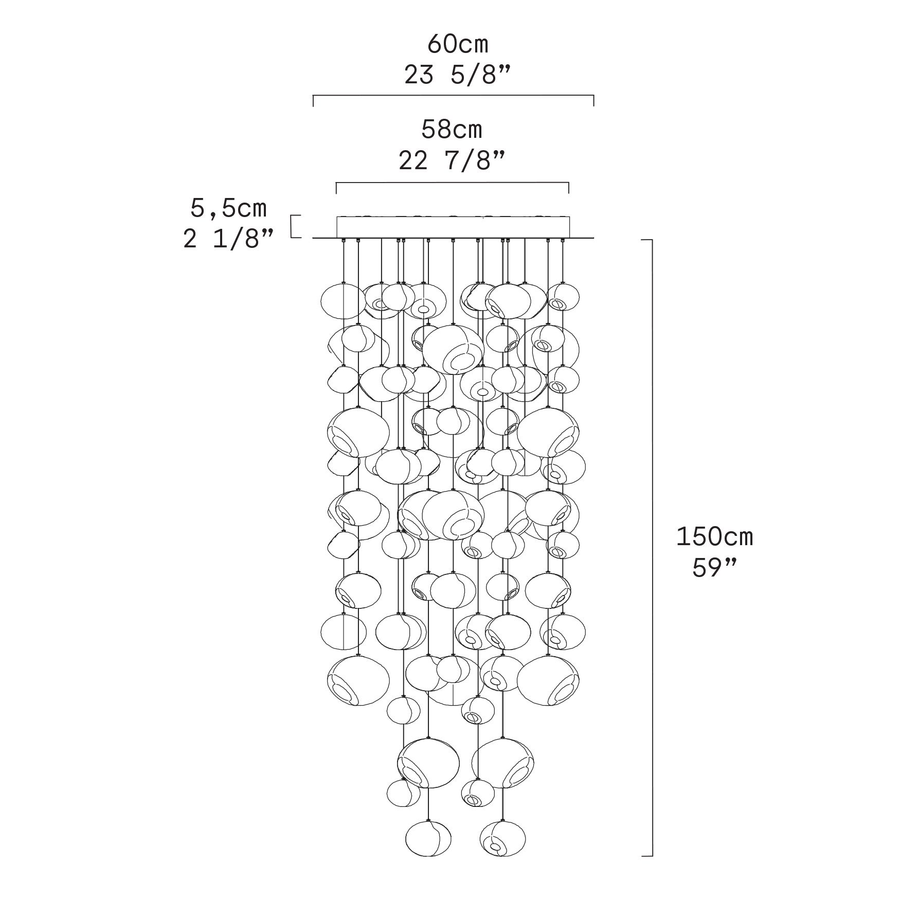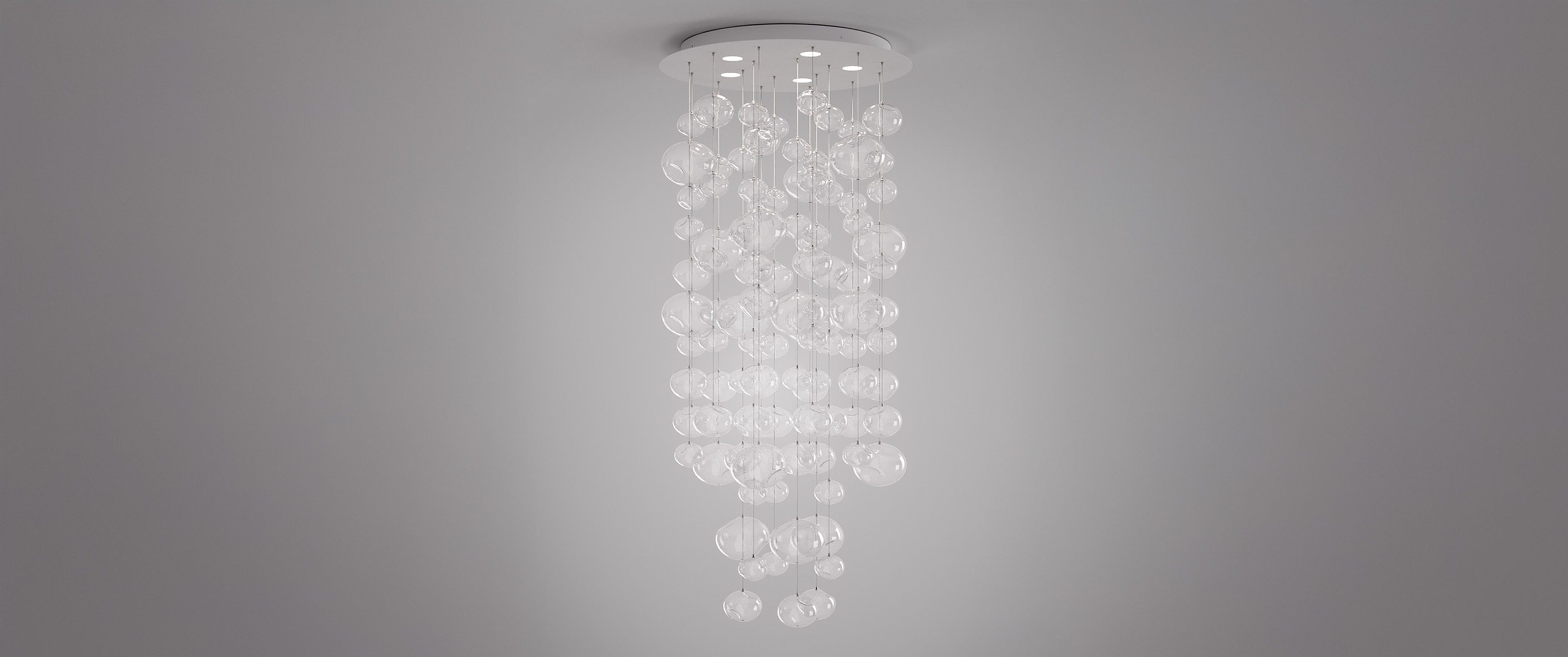 Designed by Patrick Jouin, Ether is a suspension lamp that illuminates and transforms the space with its cascading composition of transparent blown borosilicate glass spheres. It is composed of fields of three sizes of glass elements, each hand made and uniquely dimpled so that no two are alike. The results is an ether of shimmering glass and light that will dazzle and delight. Ether is available in 3 standard versions (Ethers S, Ether S 90 and Ether S 150) but can be customized into any size, finish or configuration. Today, Ether evolves with the integration of LED light sources, enhancing energy efficiency and light quality, while also offering new opportunities for customized installations through an expanded range of ceiling canopies. The new metal canopies in matte white are now available in two round sizes (Ø48 cm and Ø68 cm) and a square version (70x70 cm), designed for both single and modular installations. These canopies allow multiple elements to be arranged in linear, clustered, or square compositions, providing greater design flexibility.