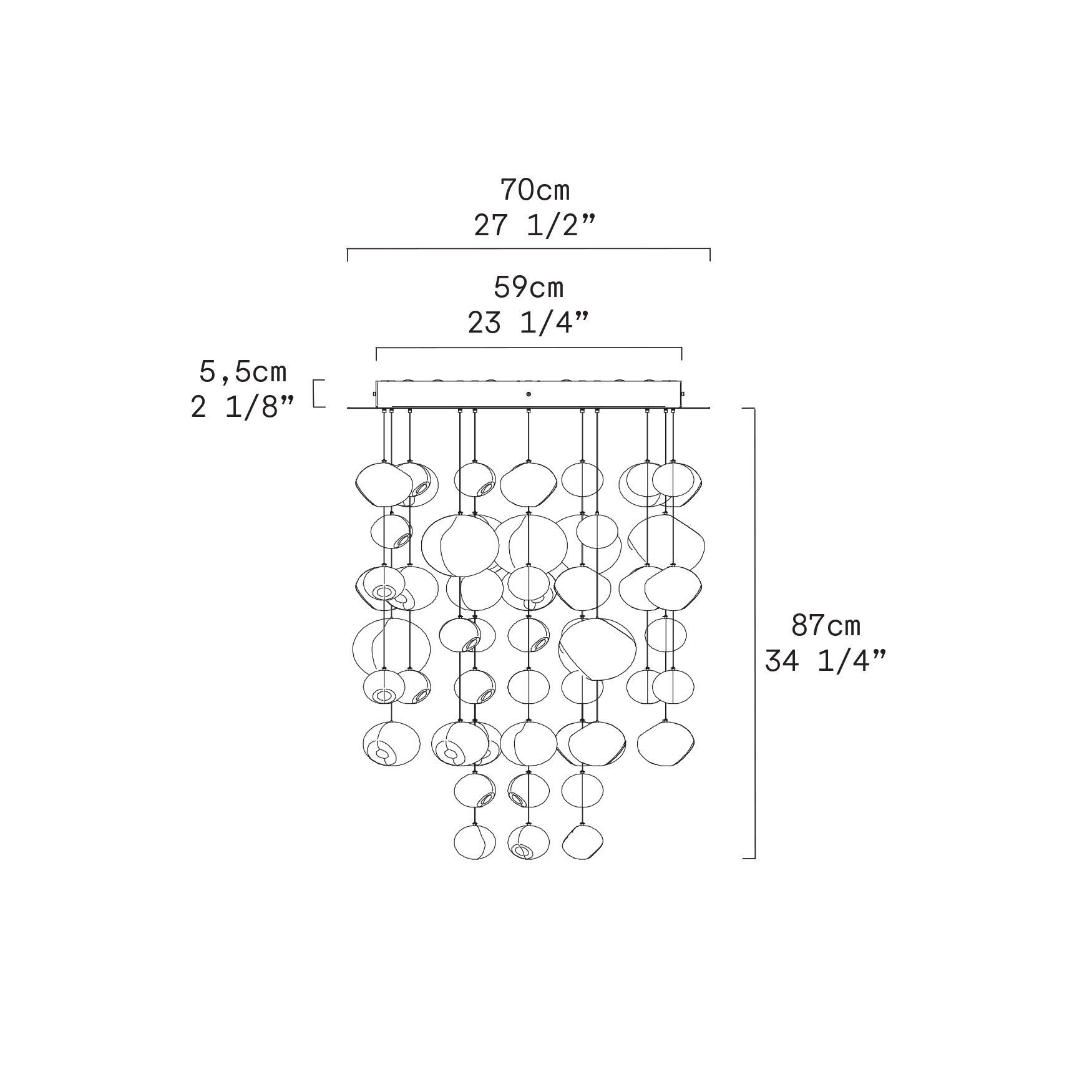 Designed by Patrick Jouin, Ether is a suspension lamp that illuminates and transforms the space with its cascading composition of transparent blown borosilicate glass spheres. It is composed of fields of three sizes of glass elements, each hand made and uniquely dimpled so that no two are alike. The results is an ether of shimmering glass and light that will dazzle and delight. Ether is available in 3 standard versions (Ethers S, Ether S 90 and Ether S 150) but can be customized into any size, finish or configuration. Today, Ether evolves with the integration of LED light sources, enhancing energy efficiency and light quality, while also offering new opportunities for customized installations through an expanded range of ceiling canopies. The new metal canopies in matte white are now available in two round sizes (Ø48 cm and Ø68 cm) and a square version (70x70 cm), designed for both single and modular installations. These canopies allow multiple elements to be arranged in linear, clustered, or square compositions, providing greater design flexibility.