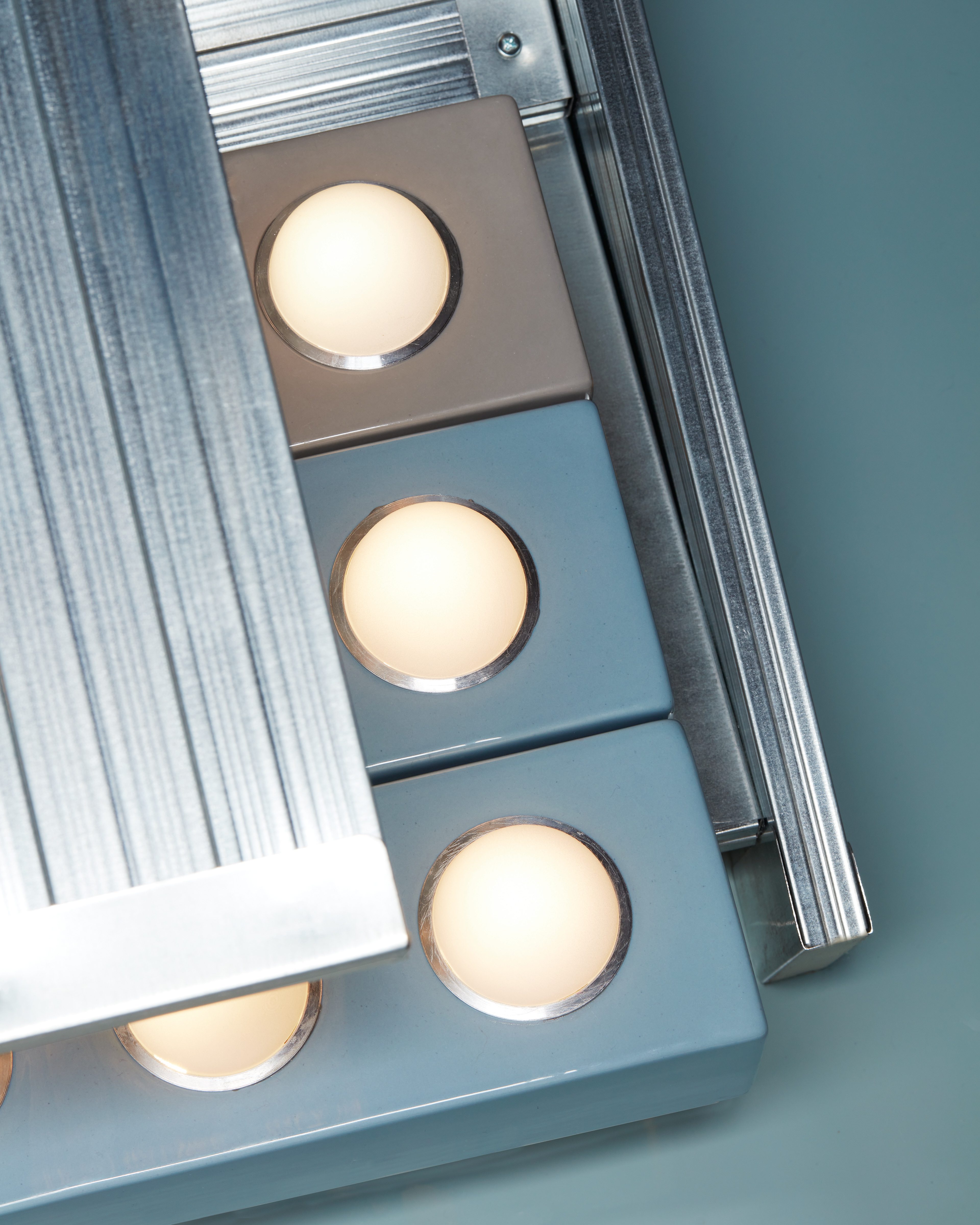 GLOWTILE Designed by RedDuo for LEUCOS, Glowtile is a modular lighting system that reinterprets the tile as an architectural element. It features glazed ceramic modules in 15×15 and 30×10 formats, for wall or ceiling installation. A handblown glass diffuser set in an anodized aluminum ring interacts with ceramic finishes in Chalk Blue, Oyster White, and Mineral Grey, transforming repetition into light, pattern, and atmosphere.