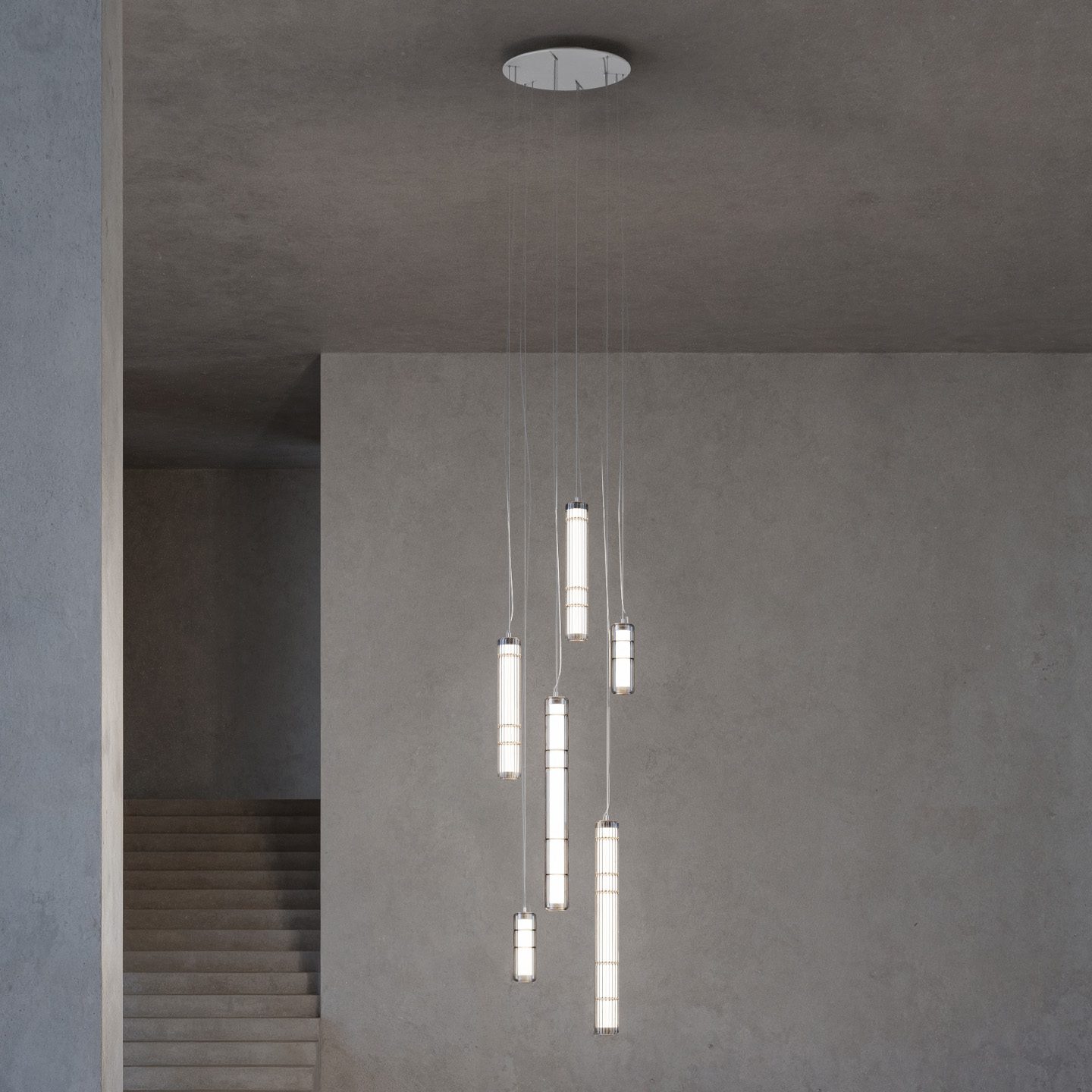 The new LEUCOS ceiling canopies are designed to support multi-light compositions, allowing multiple pendant elements to be suspended from a single power source—transforming light into a sculptural and architectural feature. Available in two versions—Round Cluster Canopy 55 (Ø55 cm) and Radial Cluster Canopy 33 (Ø33 cm)—they are made of matte white metal and designed for customized lighting arrangements. With the new LEUCOS canopies, up to 12 pendant elements can be combined, including Stacking in vertical and horizontal configurations, creating dynamic compositions of light and volume that enhance and personalize any space. The round canopy gathers suspension lights around a central point, generating a cascade of light that amplifies their three-dimensional impact. In contrast, the radial canopy, with its fan-like structure, distributes the pendants outward, resulting in a more airy and dynamic effect. Both versions are compatible with Pushdim, 0/1-10V, and DALI control systems for Stacking suspension with integrated LED light sources, ensuring advanced and flexible lighting management.