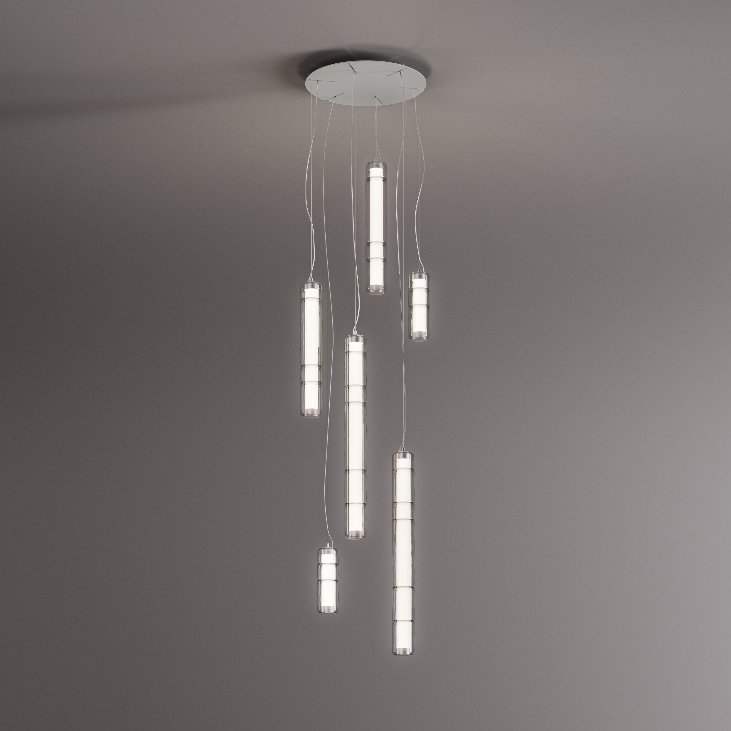 The new LEUCOS ceiling canopies are designed to support multi-light compositions, allowing multiple pendant elements to be suspended from a single power source—transforming light into a sculptural and architectural feature. Available in two versions—Round Cluster Canopy 55 (Ø55 cm) and Radial Cluster Canopy 33 (Ø33 cm)—they are made of matte white metal and designed for customized lighting arrangements. With the new LEUCOS canopies, up to 12 pendant elements can be combined, including Stacking in vertical and horizontal configurations, creating dynamic compositions of light and volume that enhance and personalize any space. The round canopy gathers suspension lights around a central point, generating a cascade of light that amplifies their three-dimensional impact. In contrast, the radial canopy, with its fan-like structure, distributes the pendants outward, resulting in a more airy and dynamic effect. Both versions are compatible with Pushdim, 0/1-10V, and DALI control systems for Stacking suspension with integrated LED light sources, ensuring advanced and flexible lighting management.