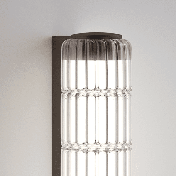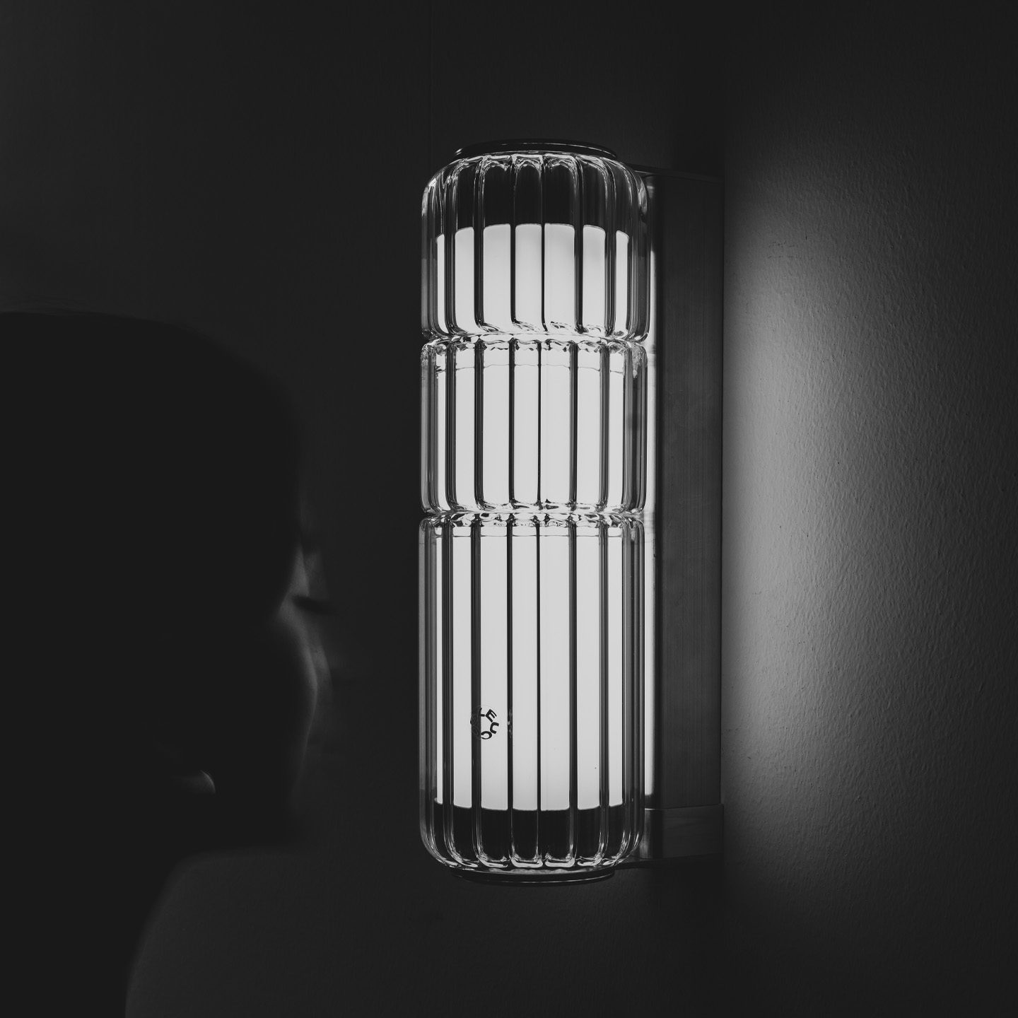 After defining its signature aesthetic through iconic floor and suspension versions, David Rockwell expands the modular language of Stacking with new wall and ceiling applications featuring single-glass variations. The collection grows with two new applications, available in 30 cm and 60 cm heights (both with a Ø10 cm profile, matching the suspension versions), installable both vertically and horizontally, allowing for unique luminous effects in any setting. The blown borosilicate glass diffuser, available in stacked cylindrical modules or as a single-glass variation, comes in transparent, ribbed, painted, or PVD finishes, combined with an anodized aluminum or matte black wrinkled metal structure. The new transparent ribbed glass option adds a distinctive striped texture, enhancing the dynamic and evocative interplay of light. With this evolution, the Stacking collection offers even greater versatility, turning light into a defining architectural element within a space.