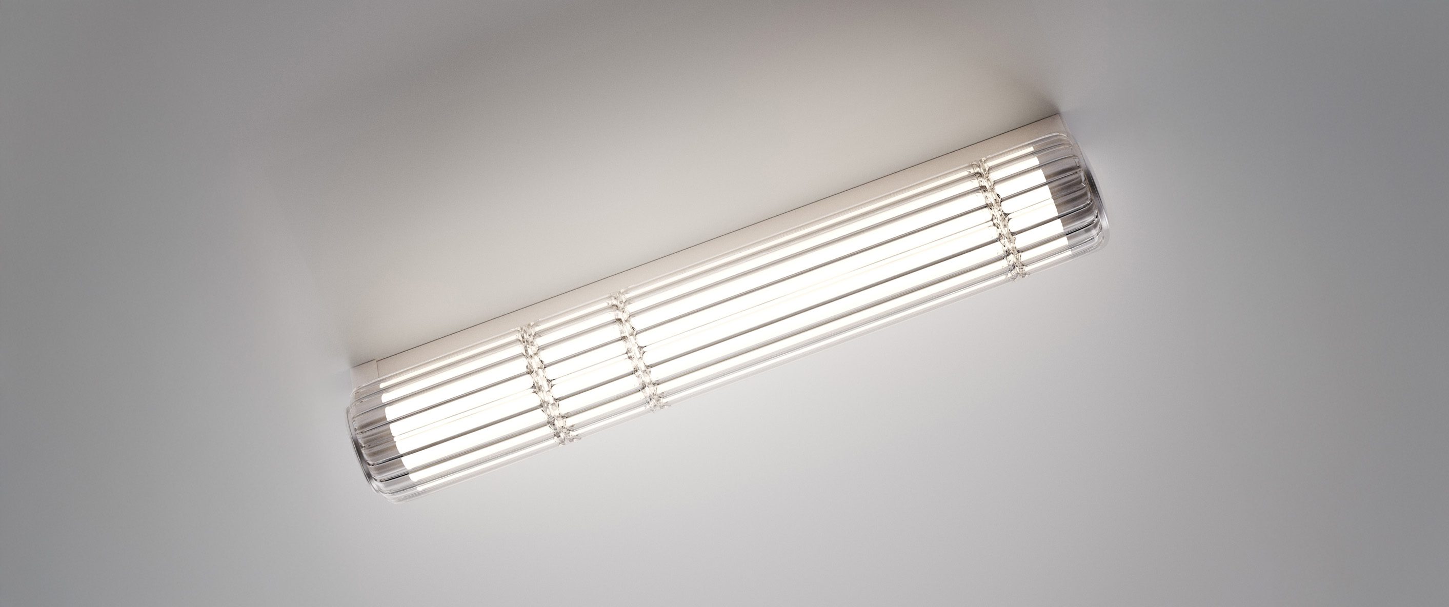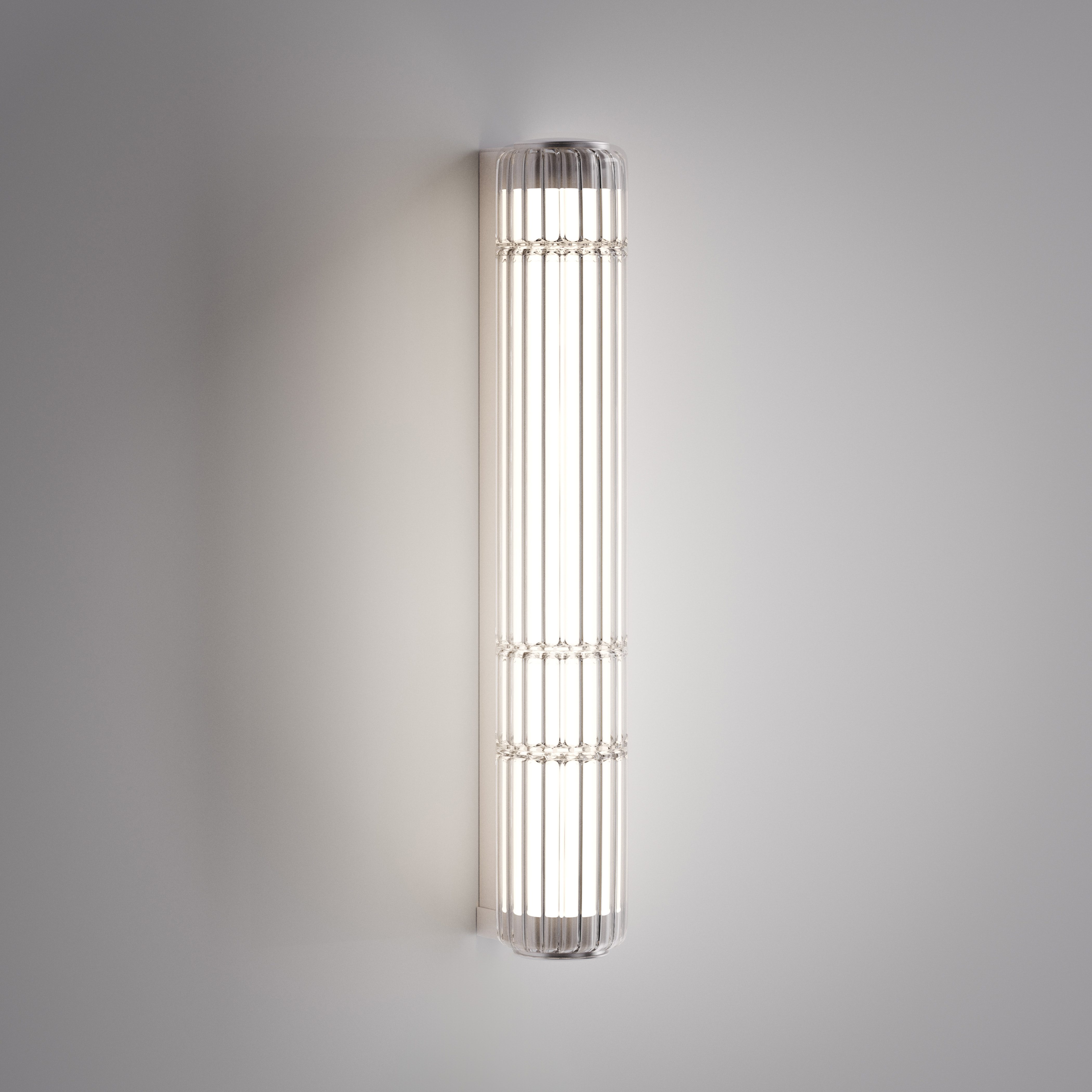 After defining its signature aesthetic through iconic floor and suspension versions, David Rockwell expands the modular language of Stacking with new wall and ceiling applications featuring single-glass variations. The collection grows with two new applications, available in 30 cm and 60 cm heights (both with a Ø10 cm profile, matching the suspension versions), installable both vertically and horizontally, allowing for unique luminous effects in any setting. The blown borosilicate glass diffuser, available in stacked cylindrical modules or as a single-glass variation, comes in transparent, ribbed, painted, or PVD finishes, combined with an anodized aluminum or matte black wrinkled metal structure. The new transparent ribbed glass option adds a distinctive striped texture, enhancing the dynamic and evocative interplay of light. With this evolution, the Stacking collection offers even greater versatility, turning light into a defining architectural element within a space.