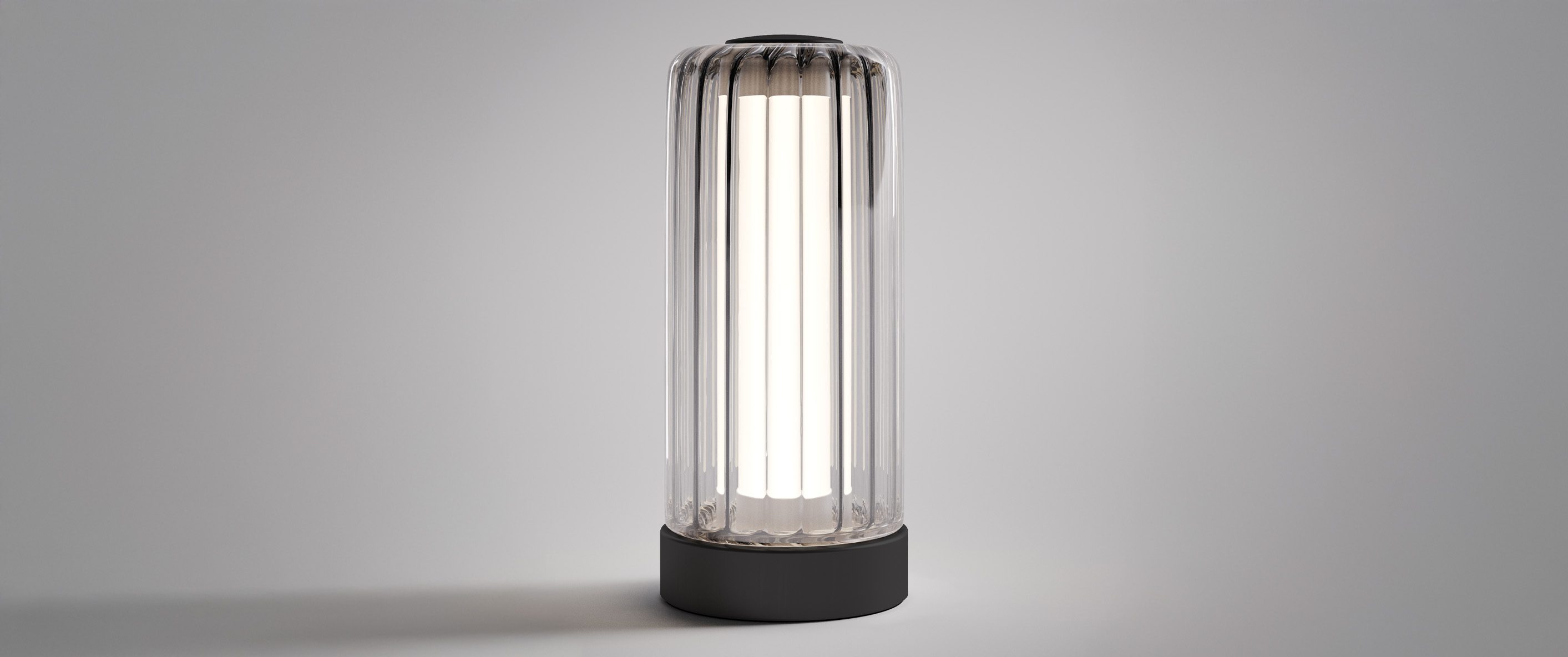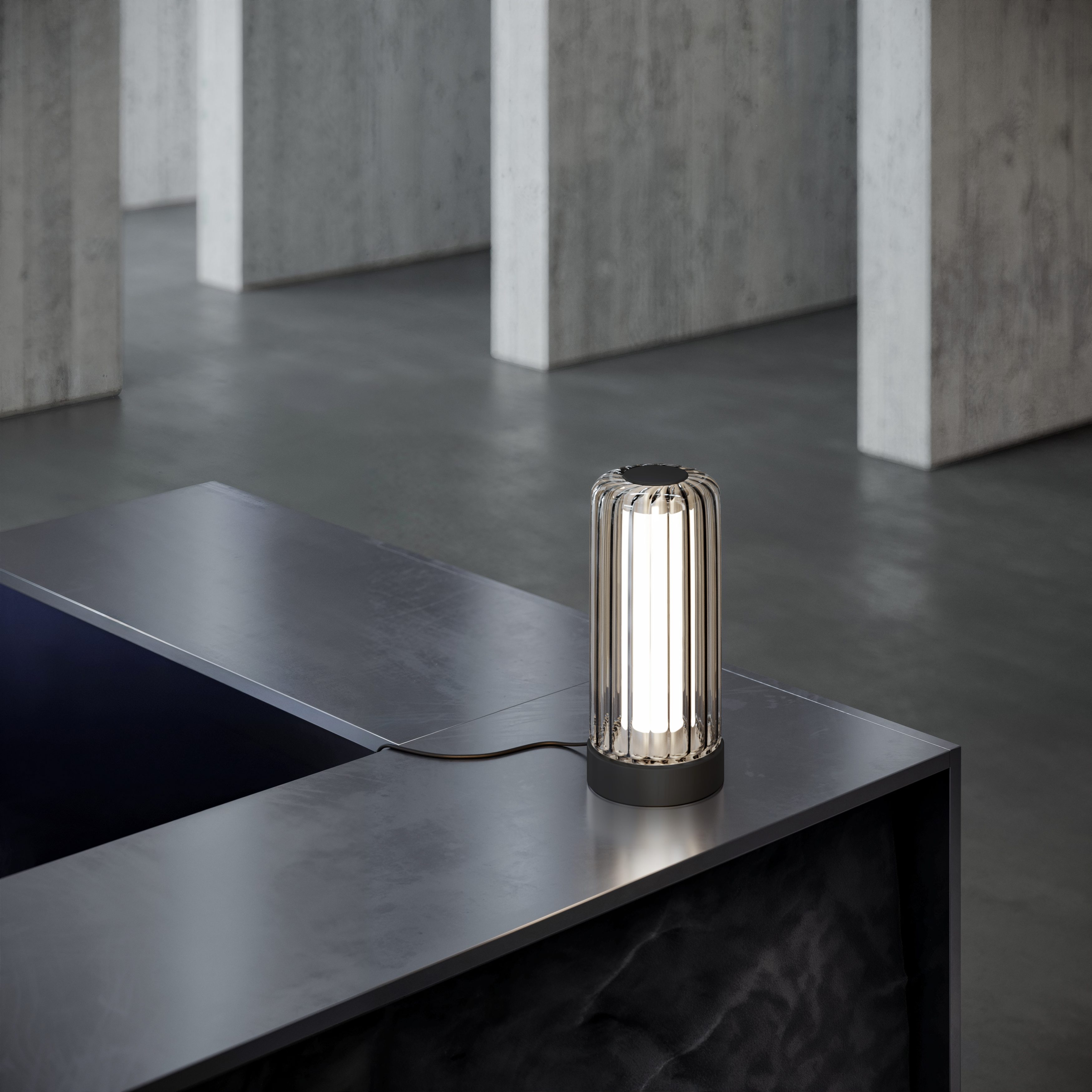 After defining its iconic floor, suspension, and wall-ceiling versions, David Rockwell expands the modular language of Stacking with a new table lamp, distinguished by the collection’s signature aesthetic. Stacking T is a refined interpretation that brings the architectural beauty of Stacking into more intimate settings, creating a warm and sophisticated atmosphere. The blown borosilicate glass diffuser, offered in a single-glass variation, features a ribbed finish paired with a matte black metal structure. The transparent ribbed glass introduces a distinctive striped texture, enhancing the dynamic and evocative interplay of light. Stacking T is a design statement that brings the elegance of Stacking into a new dimension, perfect for residential environments.
