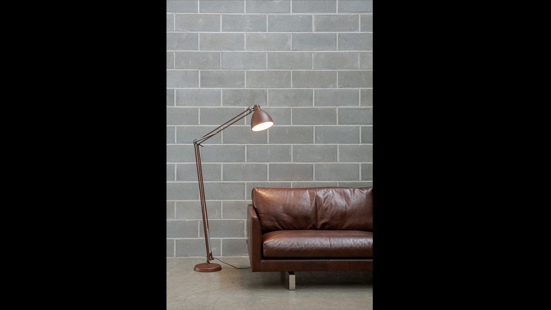 Floor lamp in matte lacquered steel with aluminum diffuser. Orientable arms and diffuser. Available in white, black, amaranth red, mica blue, sablè grey and rust brown. Interior of the diffuser in white lacquer. Available in E27 (on-off) or dimmable integrated LED (user replaceable) with “touch-dimmer” on diffuser.
