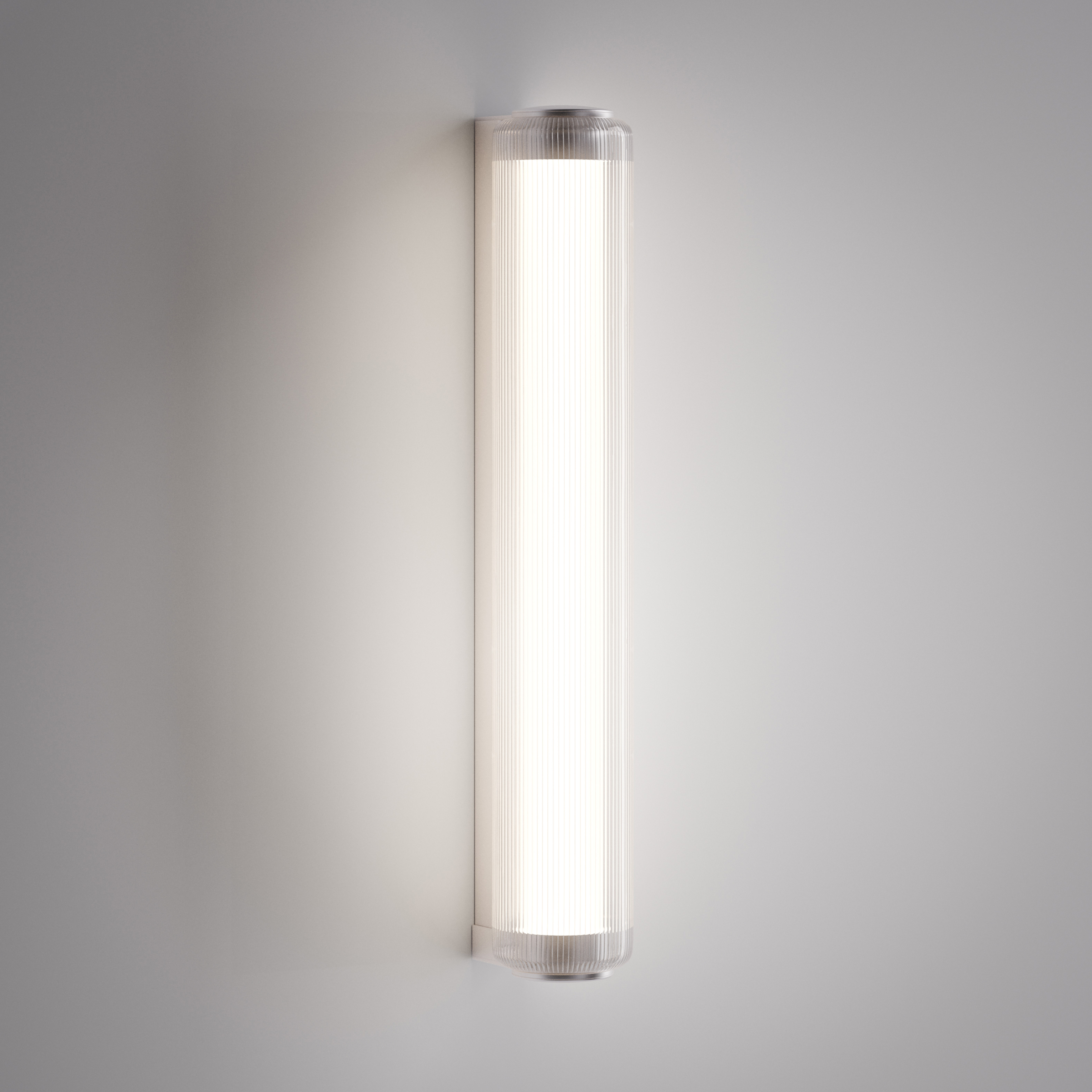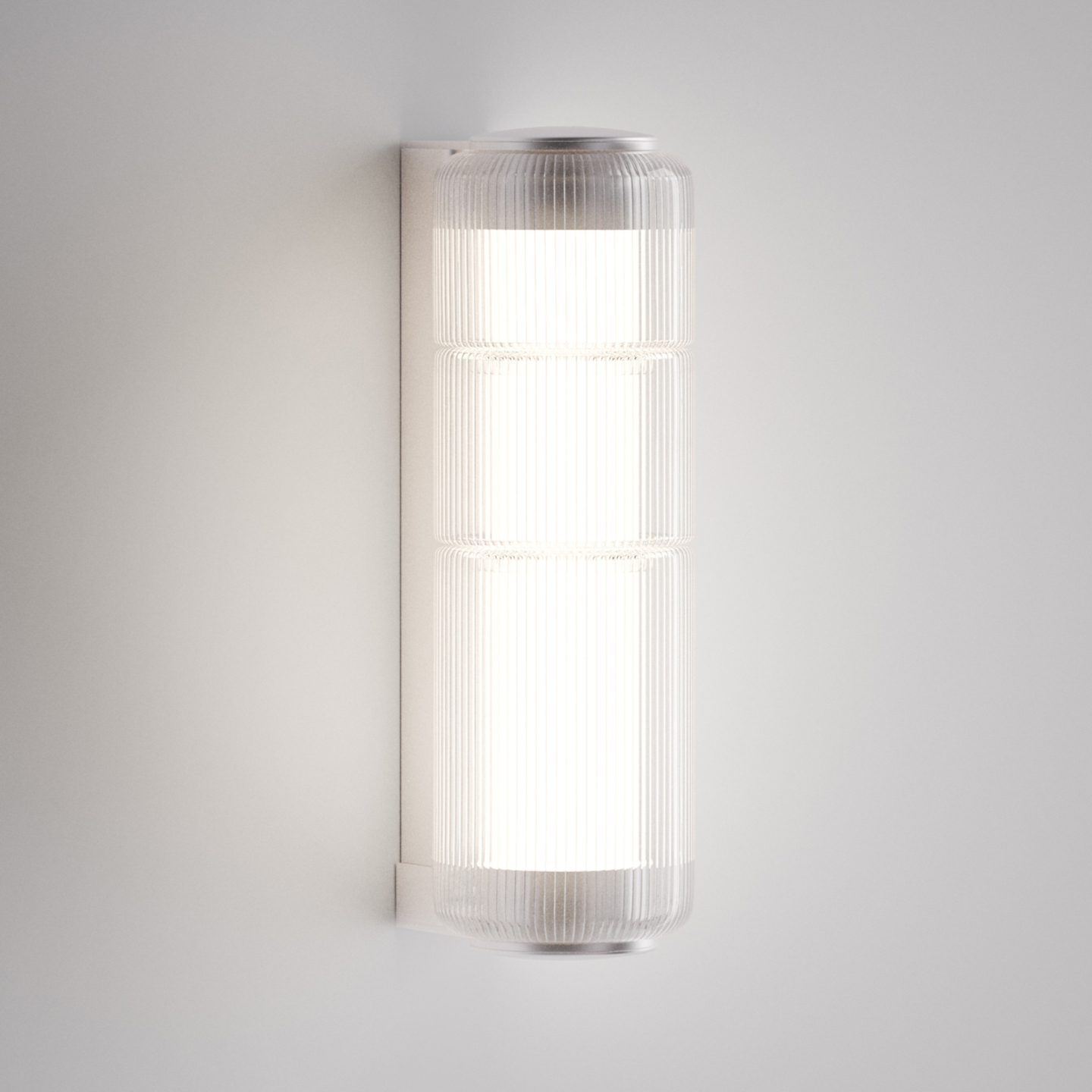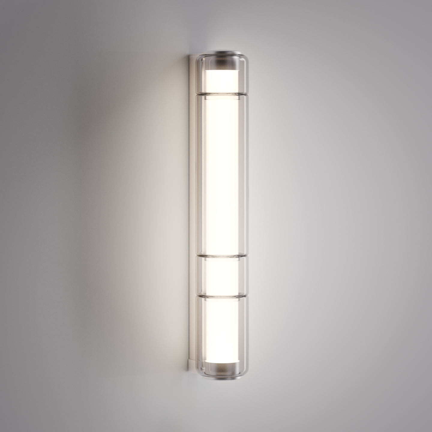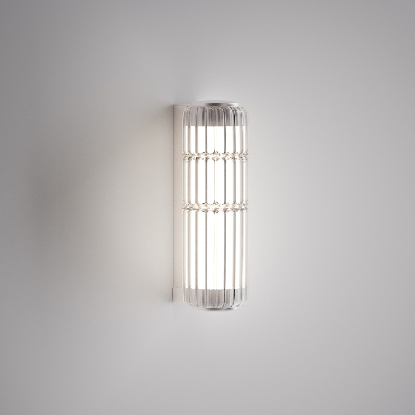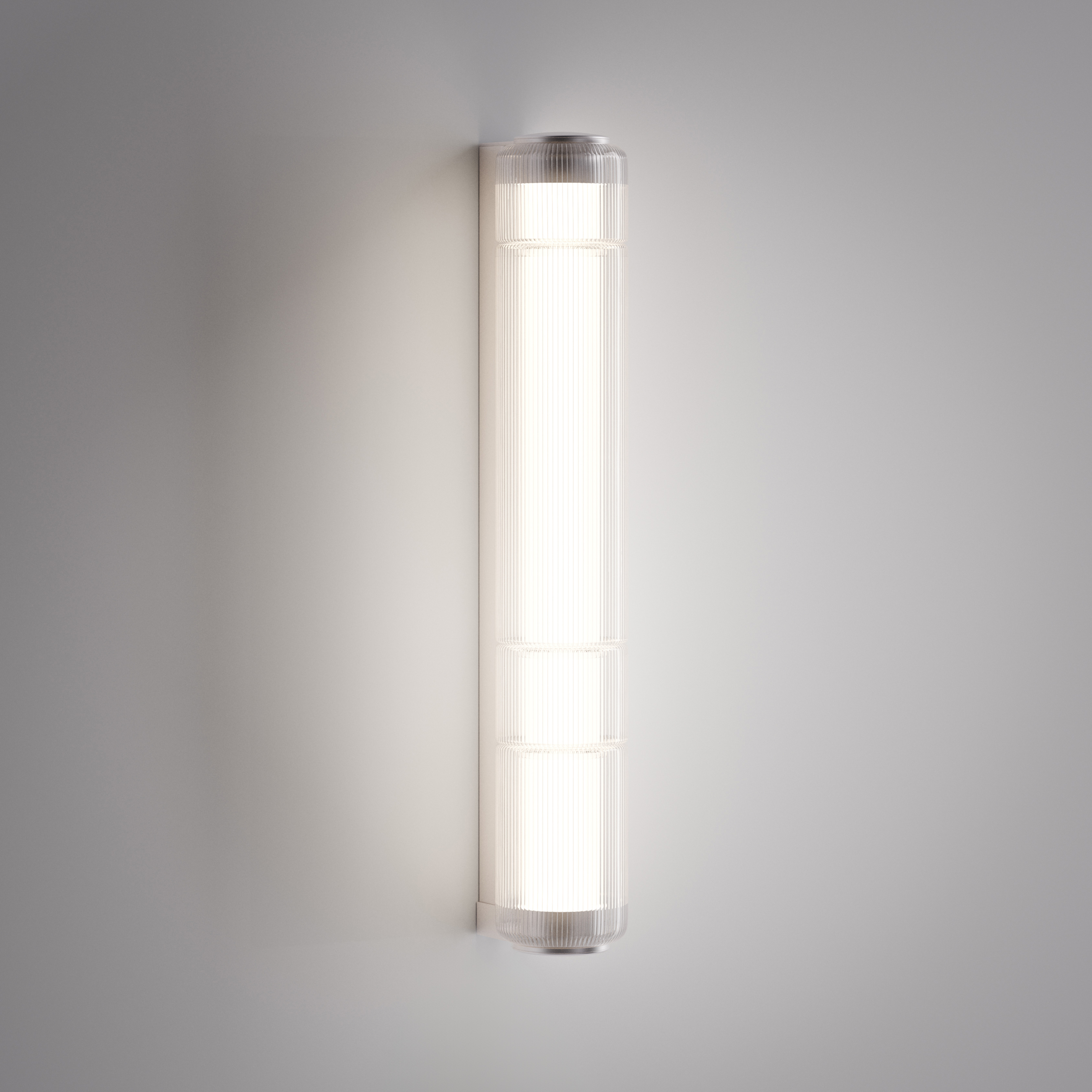 After defining its signature aesthetic through iconic floor and suspension versions, David Rockwell expands the modular language of Stacking with new wall and ceiling applications featuring single-glass variations. The collection grows with two new applications, available in 30 cm and 60 cm heights (both with a Ø10 cm profile, matching the suspension versions), installable both vertically and horizontally, allowing for unique luminous effects in any setting. The blown borosilicate glass diffuser, available in stacked cylindrical modules or as a single-glass variation, comes in transparent, ribbed, painted, or PVD finishes, combined with an anodized aluminum or matte black wrinkled metal structure. The new transparent ribbed glass option adds a distinctive striped texture, enhancing the dynamic and evocative interplay of light. With this evolution, the Stacking collection offers even greater versatility, turning light into a defining architectural element within a space.